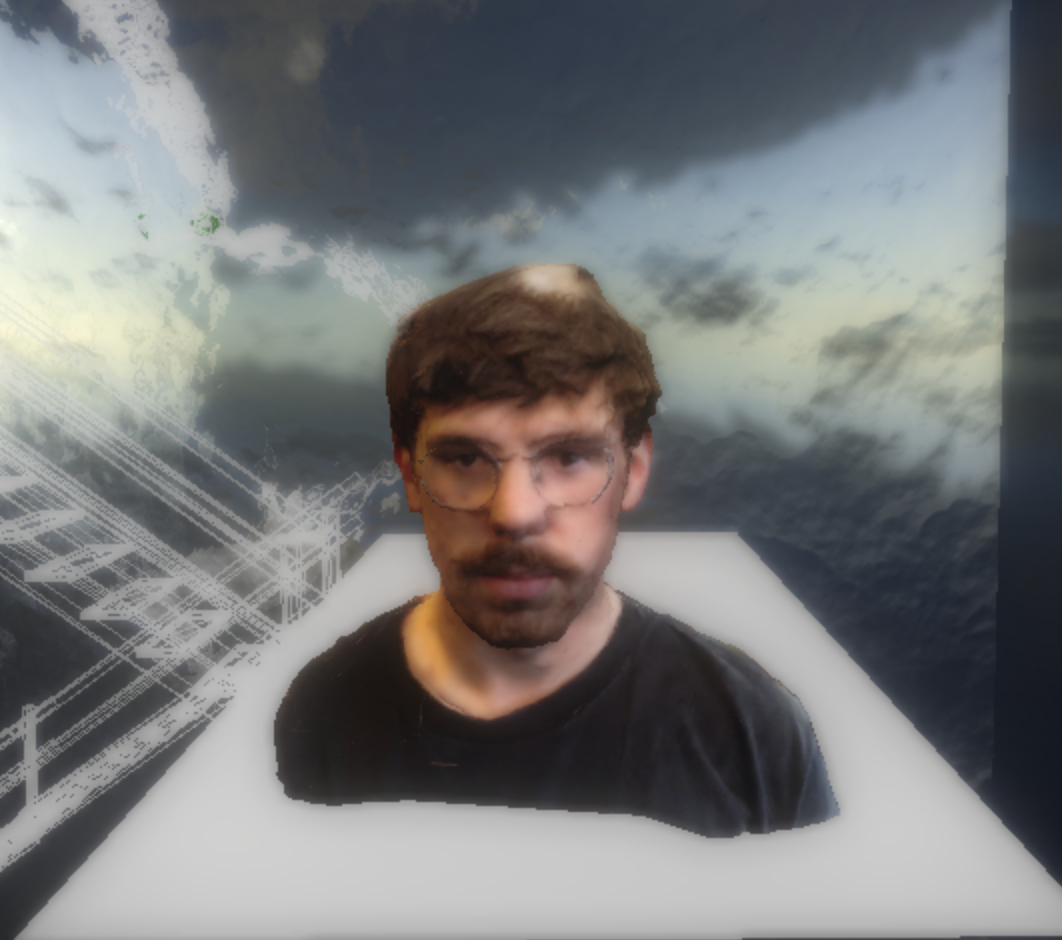 This project features a variety of 3D objects in it, sourced from a variety of places. First, there’s the three.js water sketch that forms the reflective back walls. Next, there’s the bloom effects that were swiped from this code right here. Everything else is three.js boilerplate. I had fun scanning and importing a model of my own face into the sketch, which looks lik